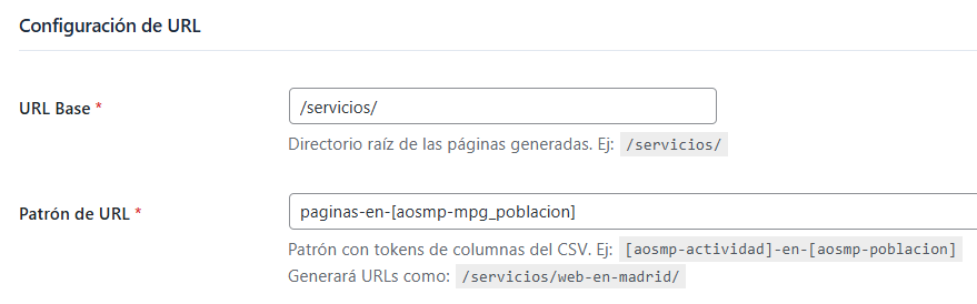 - URL Base: La «carpeta» virtual donde vivirán estas páginas (ej: `/servicios/`).